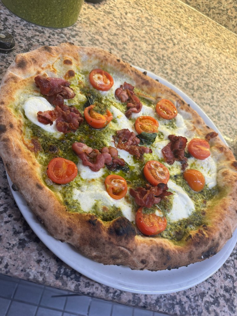 mit Basilikumsauce Bufalo Mozzarella, Cherry Tomaten und knosperli Speck